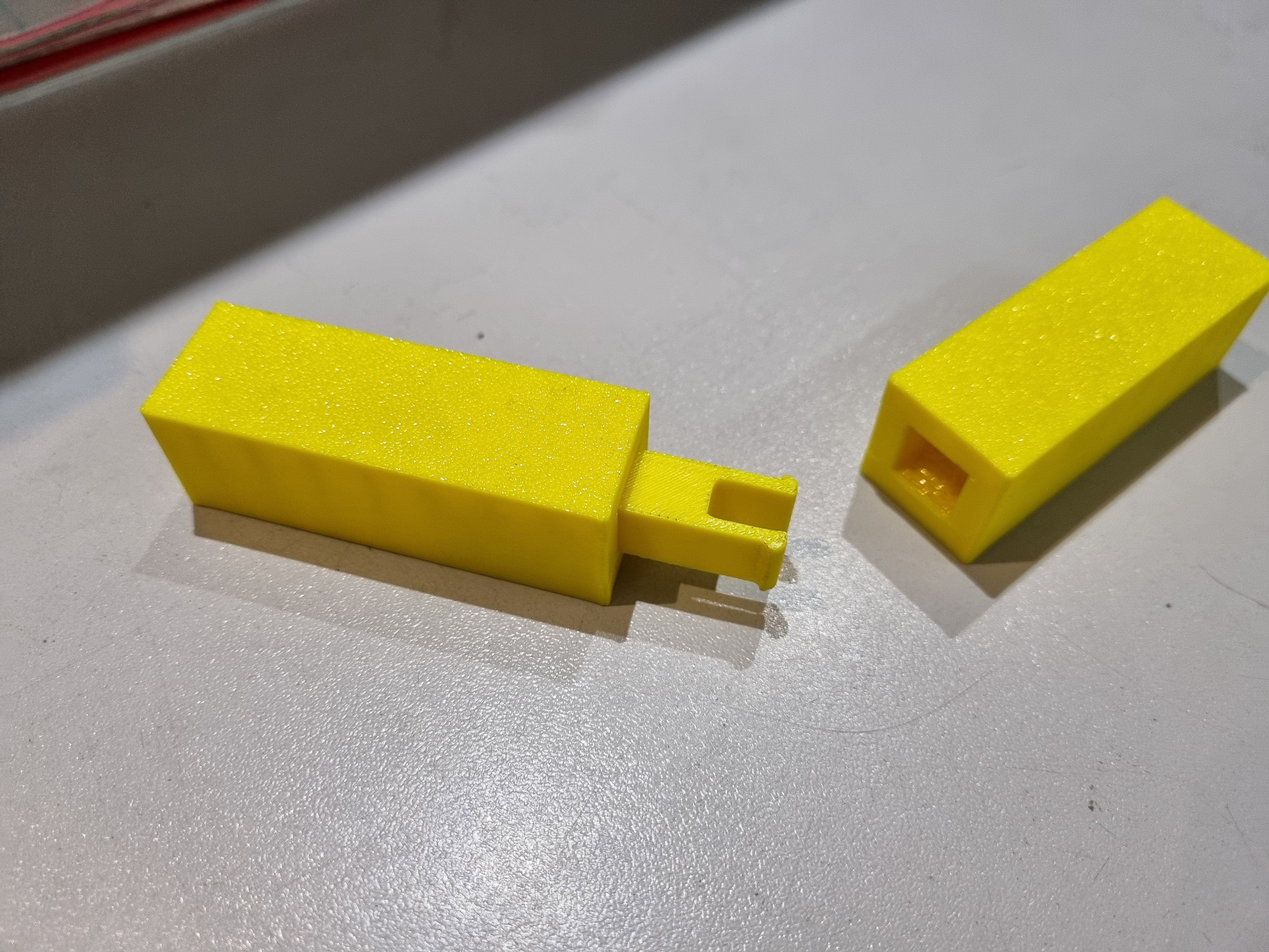 The first attempt was with PLA, and it came out great. But the design was tight... realy tight.... so I redesigned the 'male' part 0.1 mm smaller on all sides. Then printed in PETG and the connected realy well.