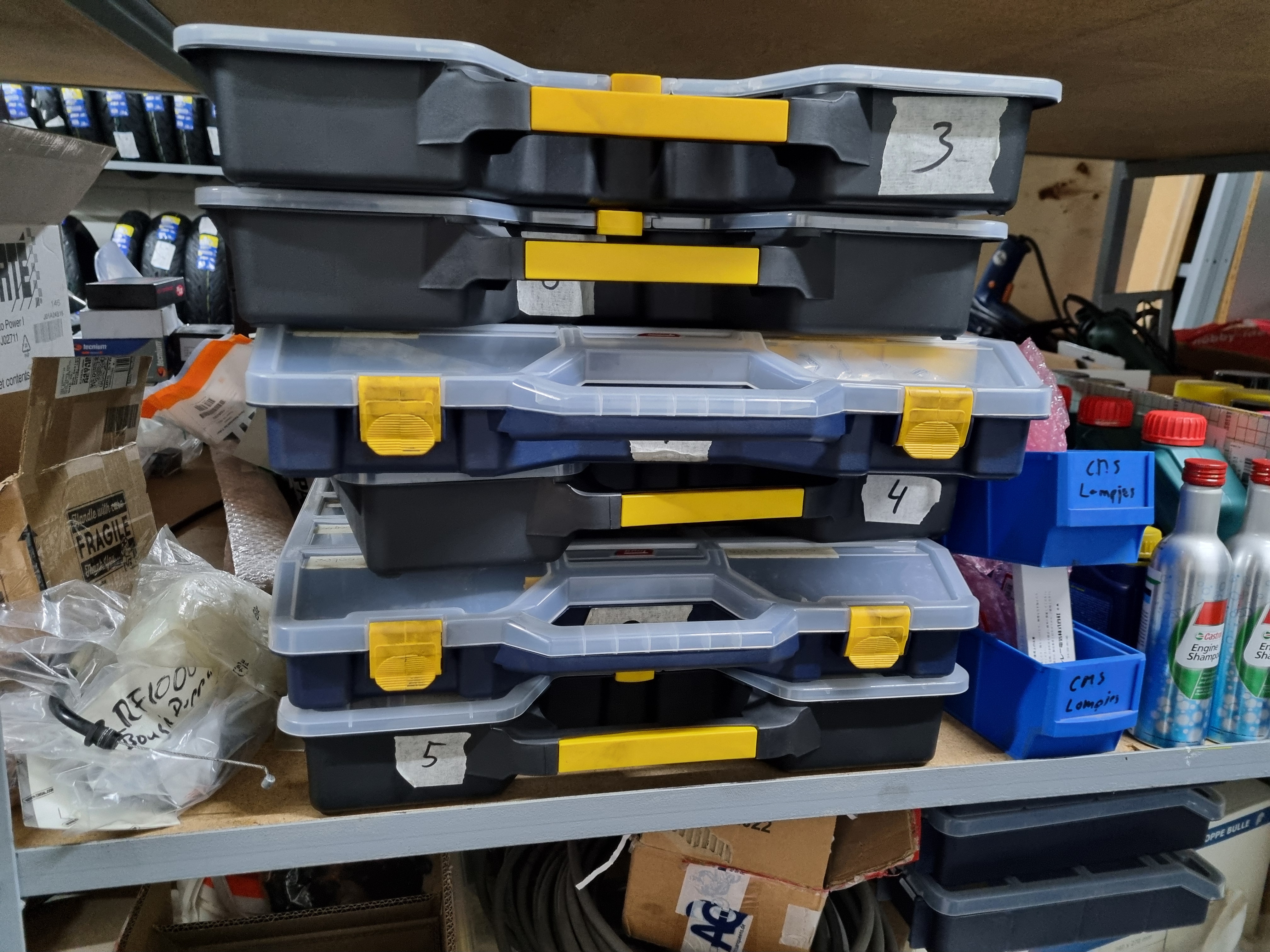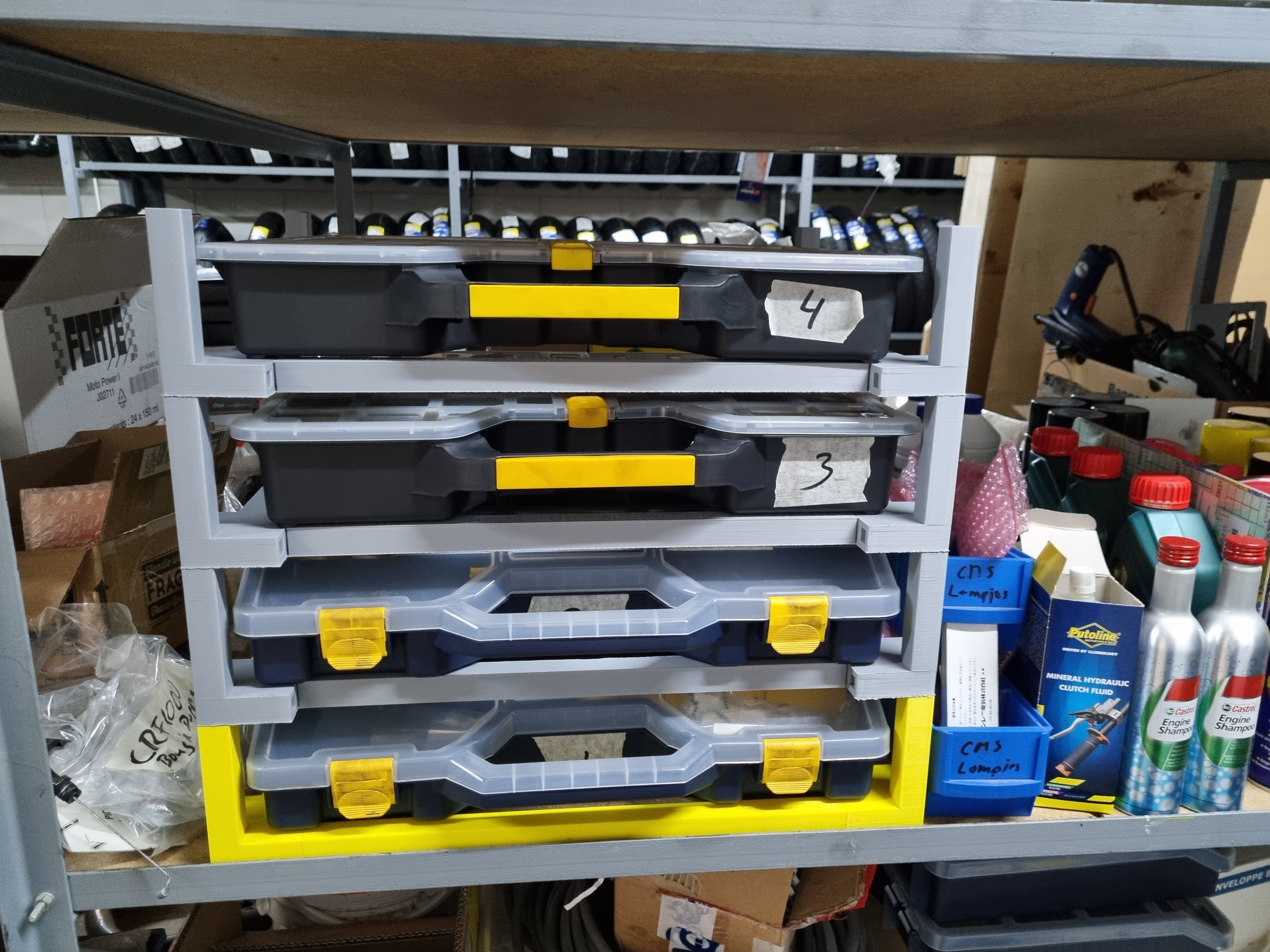 I have 6 storage boxes with small motorcycle parts. The boxes are stacked on top of each other, and each time I need a box I have to remove the boxes on top of it before I can take the required box out.